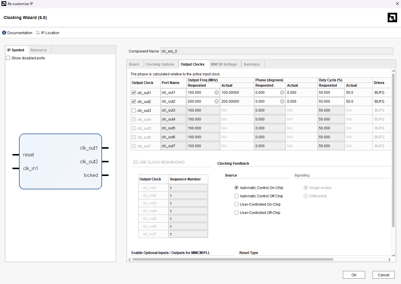 Double click “Clocking Wizard” IP and customize “Output Clocks” settings as shown in the following image.