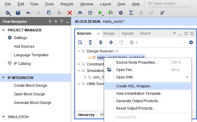 Right-click “mimas_a7” in the “Sources” window, and select “Create HDL Wrapper” from the popup menu. Click “OK” on the window that appears to finish generating a wrapper.
