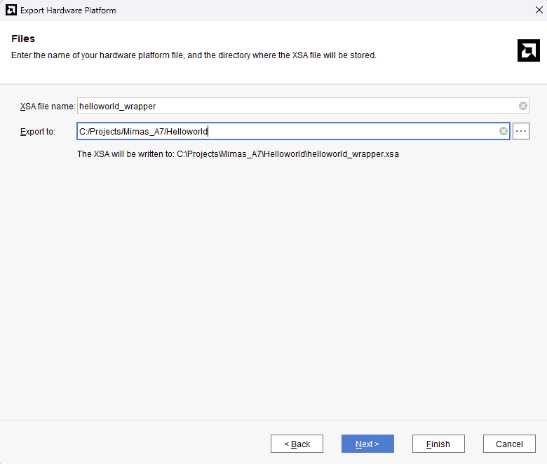Provide the XSA file name and save it at a suitable location. Click Next and click Finish in the next dialog box.