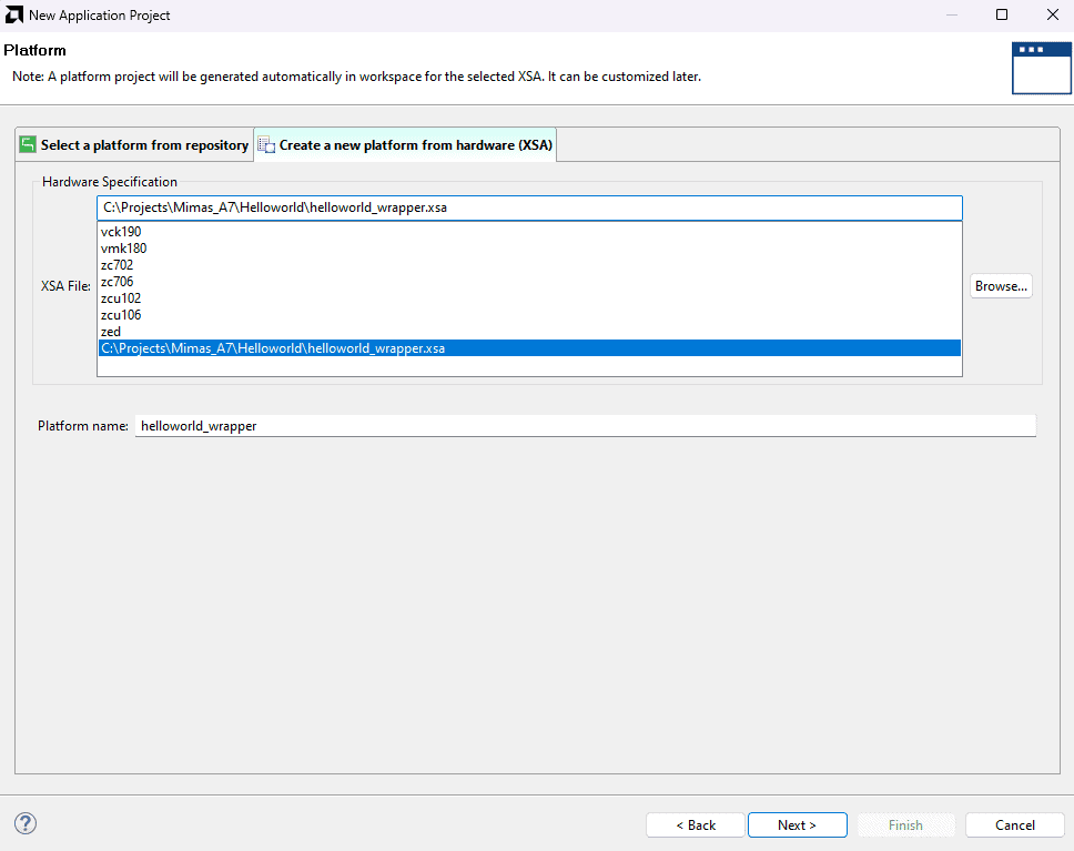 In the Platform window, select Create a new platform from hardware tab and import the XSA file which is already created (Provide XSA file location). Click Next.