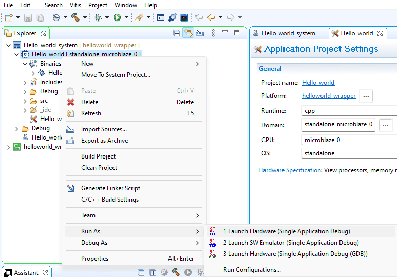 Open the COM port corresponding to Mimas A7 in any serial terminal (PuTTY, Tera Term, etc.) with a 9600 baud rate (the default baud rate given in UART IP). Now, right-click on the .elf file in Project Explorer and select “Launch Hardware” as shown below.