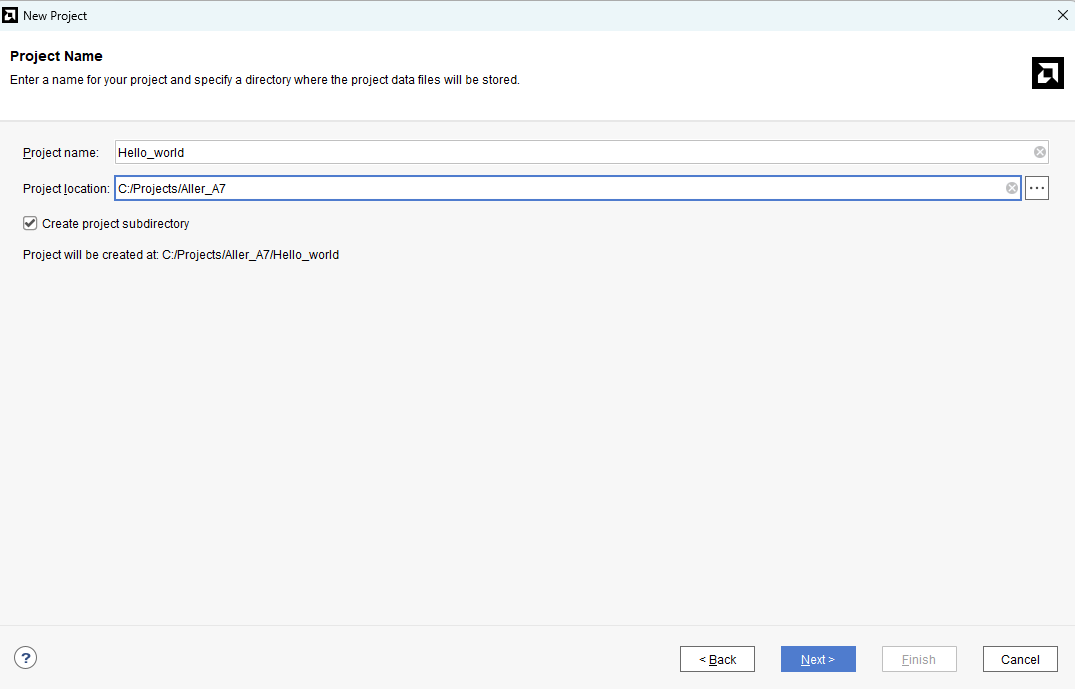For this example, “Aller_MicroBlaze” is used as the project name, but feel free to use any name. Click “Next” without making any changes until you see the “Default Part” page.