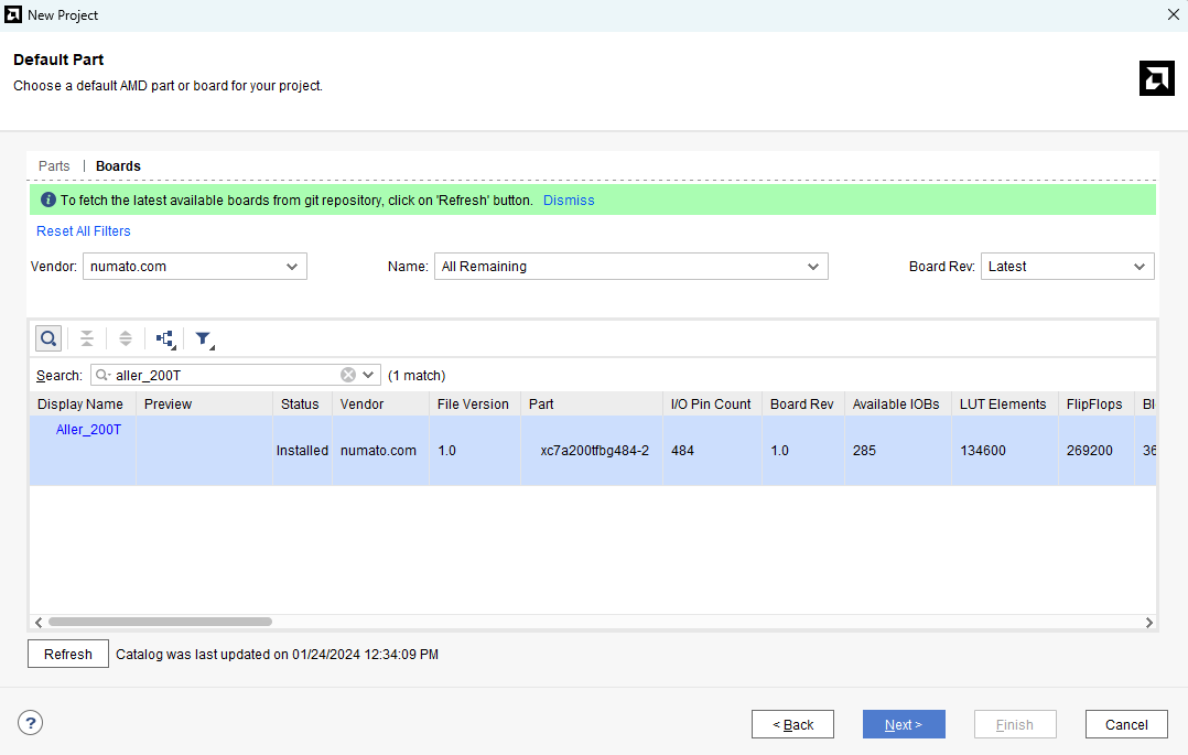 In the “Default Part” window, select the “Boards” tab. Choose the Vendor as “numato.com”, filter the Name “Aller_200T” and select the board as shown below. If Aller is not displayed in the Boards list, make sure that the board support files are installed correctly.