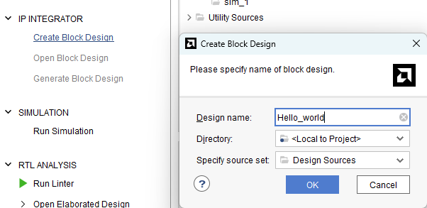 Under the “Flow Navigator” panel, click “Create Block Design” under the IP Integrator section. Enter a name for the block design and click “OK”.