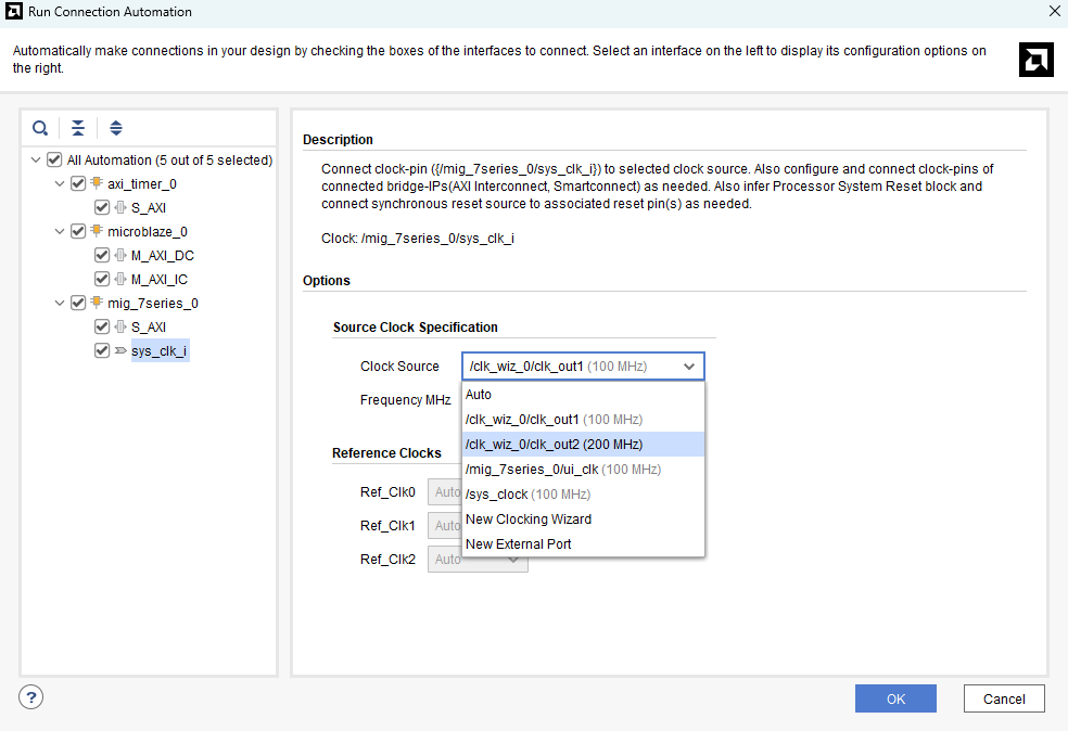 Click “Run Connection Automation” and select the “All Automation” checkbox as shown in the image below. Now, select sys_clk_i under “mig_7series_0” and choose the “Clock Source” as clk_out2 the output of the Clocking Wizard. Click “OK”.