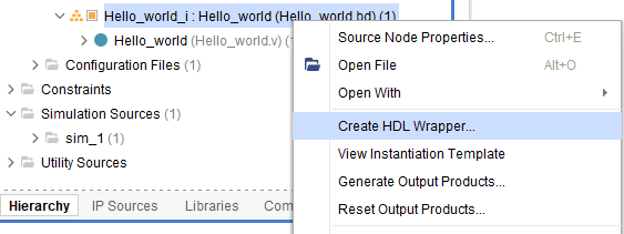 Right-click “Hello_world_i” in the “Sources” window, and select “Create HDL Wrapper” from the popup menu. Click “OK” on the window that appears to finish generating a wrapper.