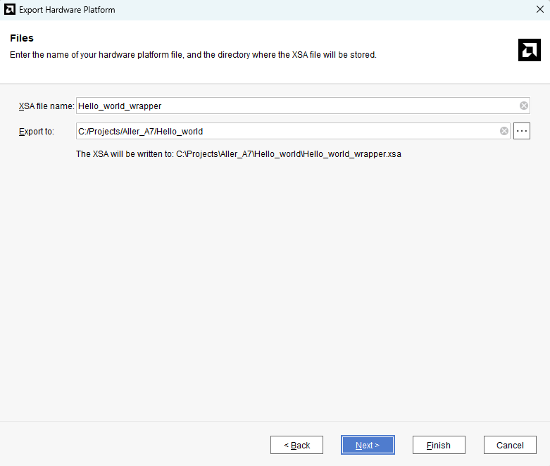 Provide the XSA file name and save it at a suitable location. Click Next and click Finish in the next dialog box.