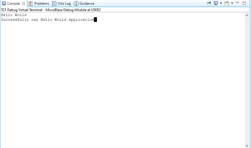 If everything went well, the Hello World application running on the board should print “Hello World” over the JTAG UART and the output should be displayed in the Vitis console terminal as shown in the image below.