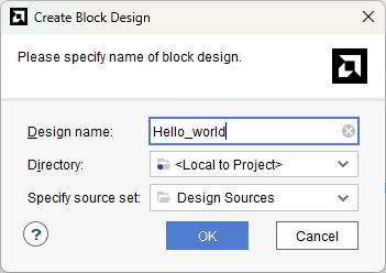 Under the “Flow Navigator” panel, click “Create Block Design” under the IP Integrator section. Enter a name for the block design and click “OK”.