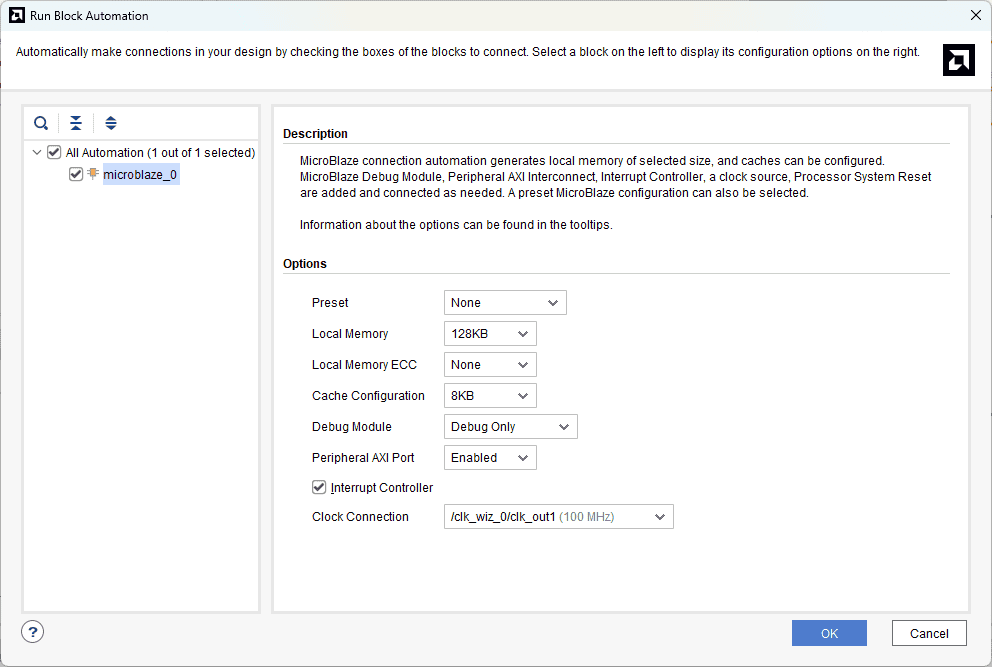 Click “Run Block Automation” and change the settings as shown below. Also, enable the “Interrupt Controller” checkbox.