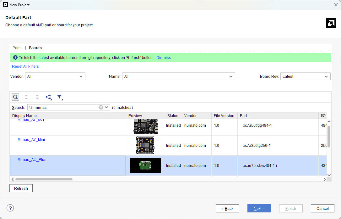 In the “Default Part” window, select the “Boards” tab. Choose the Vendor as “numato.com”, filter the Name “Mimas_AU_Plus” and select the board as shown below. If Mimas_AU_Plus is not displayed in the Boards list, make sure that the board support files (change the bsp) are installed correctly.