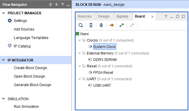 In the “Flow Navigator” panel, select the “Create Block Design” under the IP integrator section. Give an appropriate name to the design and click “OK” (the author used “narvi_design” as the design name). Select “Boards” in the “Block Design” block. The default peripherals available for the Narvi Board will be displayed.