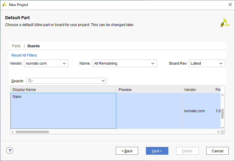 At the “Default Part” window, in “Boards” select vendor as “numato.com” and select the board name “Narvi” and click “Next” to continue. If Narvi is not displayed in the boards list, you will need to install Narvi board support files appropriately and retry this step. You can download the Narvi board support files for Vivado from here. Follow the “readme” in the link on how to install the Vivado board files in your system.