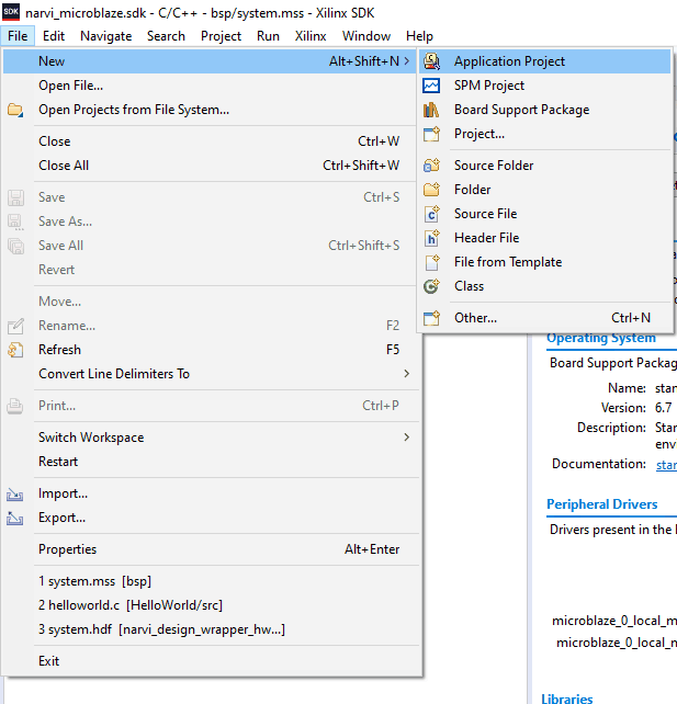 Launch SDK from the File menu. You may choose to use the local project directory as SDK workspace or select another directory. Once the SDK window appears, select “New->Application Project” from the “File” menu. Type in a project name and click “Next” to select the “Hello World” template from the list of available templates.