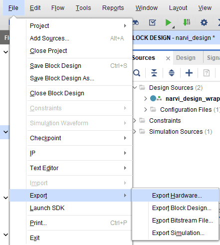 Now that implementation and generation of bitstream has been successfully completed, we need to export the hardware along with bitstream. Go to the “File” menu, select “Export->Export Hardware”. Select “Include bitstream” and click “OK”