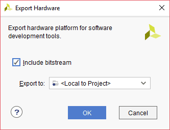 If the bitstream is generated successfully, we can export the hardware platform along with the bitstream to the Xilinx SDK. Go to “File -> Export -> Export Hardware”, and select “Include bitstream” checkbox in the window that pops up. You may select “<Local to Project>” to export the files to the local project directory or choose another directory, and click “OK”.