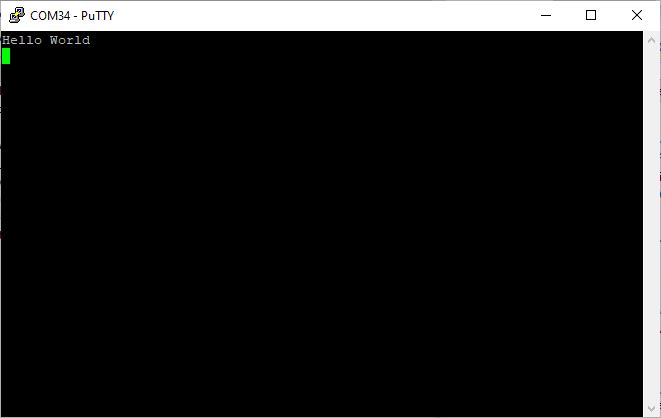 If everything went well, the application running on the board should print “Hello World” over the USB UART and the output should be displayed on the serial terminal as shown in the image below.