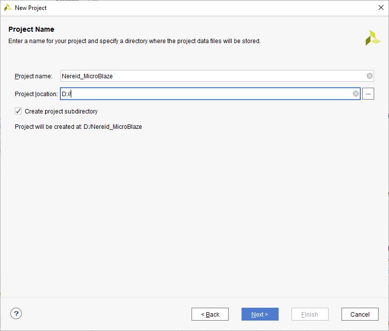 In the “Project Name” window, enter a name for the project and save it at a suitable location. Select the option “Create project subdirectory” to keep all the project files in a single folder. For this example, “Nereid_MicroBlaze” is used as the project name, but feel free to use any name. Click “Next”.