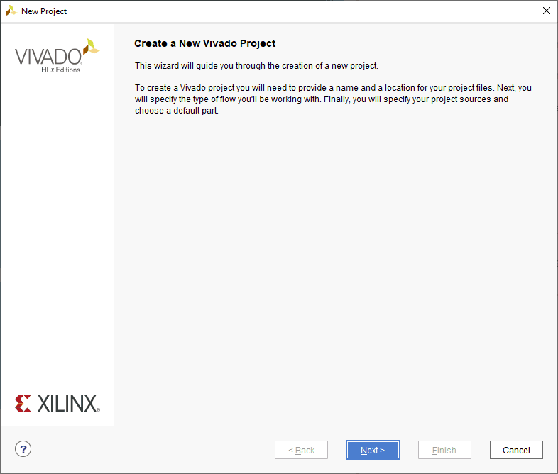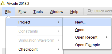 Open the Xilinx Vivado Design suite, go to “File -> Project -> New” to create a new project. The “New project” window will pop up. Click “Next” to continue