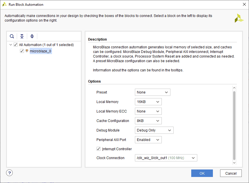 Click “Run Block Automation” on the top left corner of the window to complete the design. Select the settings as shown in the image below. Click “OK” for Vivado to automatically configure the blocks for you. Once the Block Automation is complete, click “Run Connection Automation” so Vivado can connect the blocks together to make a complete system.