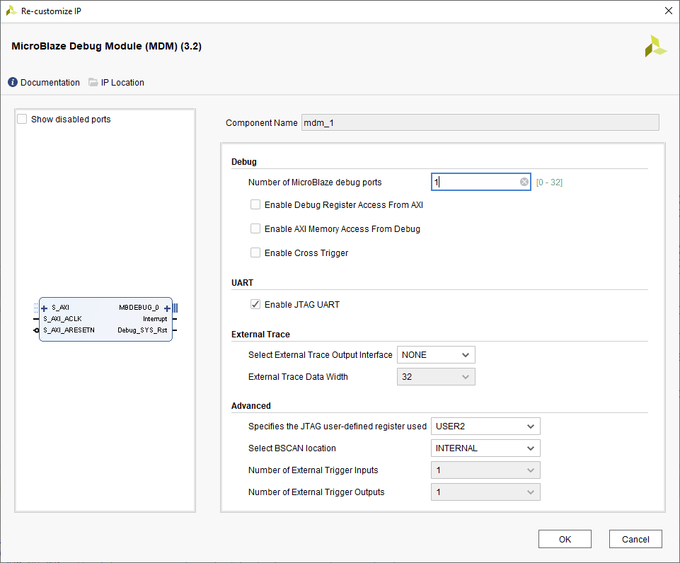 After clicking”Run Connection Automation”, you can see the complete design with all the IPs connected through the “AXI Interconnect”. Double-click on the MicroBlaze Debug Module (MDM) IP block to configure it. Select the “Enable JTAG UART” option as shown in the image below.