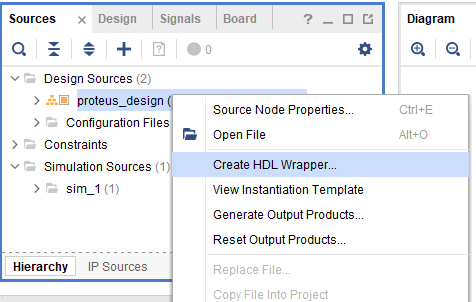 Right-click on the block design in the “Sources” window and click “Create HDL Wrapper” from the popup menu. Click “OK” in the window that appears to finish generating a wrapper.