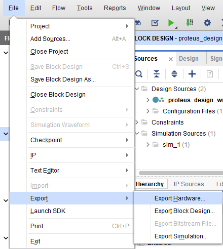 Once the implementation and generation of the bitstream have been successfully completed, we need to export the hardware along with bitstream. Go to the “File” menu, select “Export -> Export Hardware”. Select “Include bitstream” and click “OK”