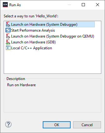 Launch SDK from the File menu. You may choose to use the local project directory as SDK workspace or select another directory. Once the SDK window appears, select “New -> Application Project” from the “File” menu. Enter a project name and click “Next” to select the “Hello World” template from the list of available templates.