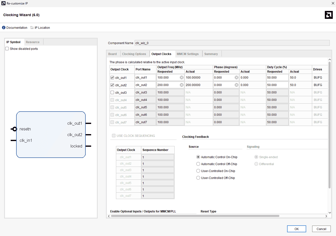 Double-click on the “Clocking Wizard” IP block and change the settings as shown below. In the “Output Clocks” section, set clk_out1 frequency to 100 MHz and clk_out2 to 200 MHz. Set “Reset Type” as Active Low and click “OK” to customize the IP.