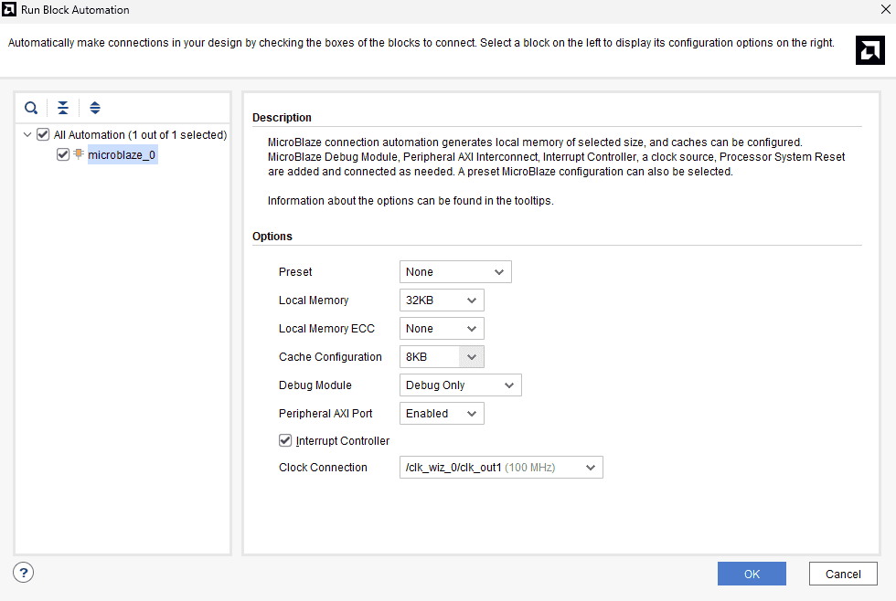 Click “Run Block Automation” present in the “Designer Assistance available” bar on the top left corner of the window to complete the design. Select the settings as shown in the following image. Click “OK” for Vivado to automatically configure the blocks for you. Once Block Automation is complete, run “Connection Automation” so Vivado can connect the blocks to make a complete system.