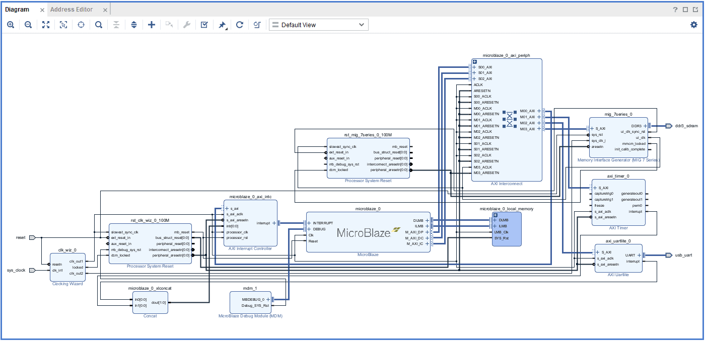 Add System Clock, DDR3 SDRAM and USB UART to the design by double-clicking the corresponding peripherals. In the Diagram window, right-click and select “Add IP” from the popup menu. Search for “MicroBlaze” & “AXI Timer” and add them to the design by double-clicking them.