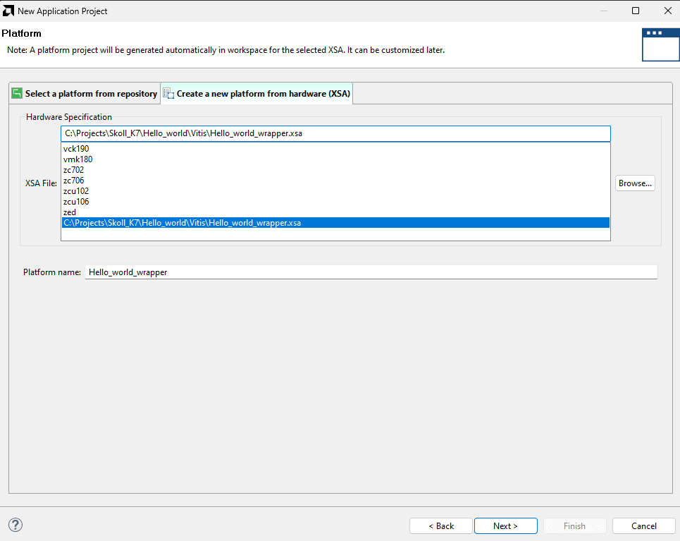 In the Platform window, select Create a new platform from hardware tab and import the XSA file which is already created (Provide XSA file location). Click Next.
