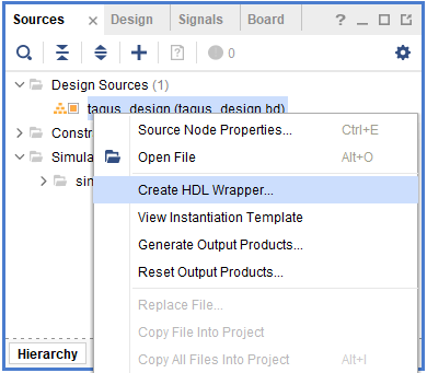 Right-click “tagus_design” in the “Sources” window, select the “Create HDL Wrapper” option from the popup menu. Click “OK” on the window that appears to finish generating a wrapper.