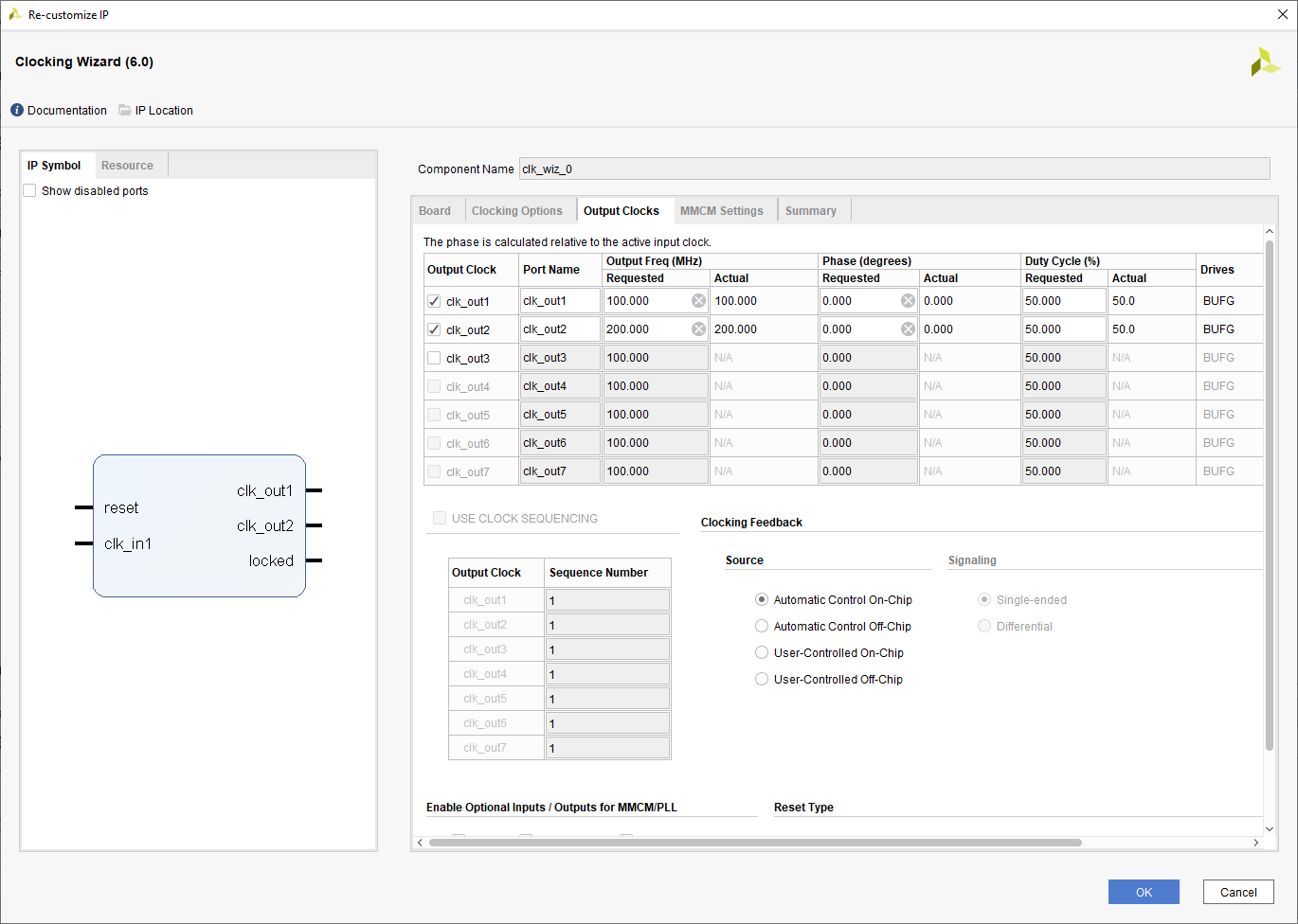 Double click “Clocking Wizard” IP and customize the “Output Clocks” settings as shown in the following image.