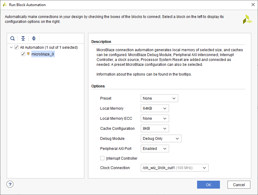 Click “Run Block Automation” present in the “Designer Assistance available” bar on the top-left corner of the window to complete the design. Select the settings as shown in the following image. Click “OK” for the Vivado to automatically configure the blocks for us.