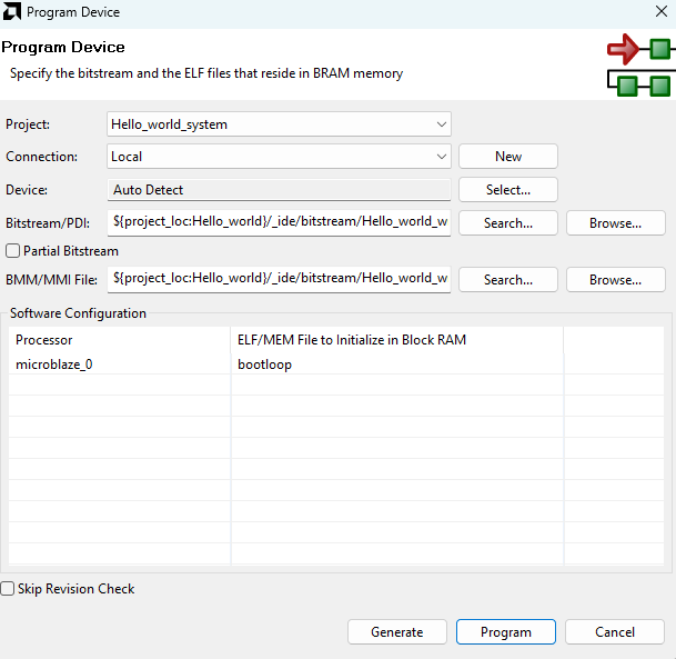 Program the FPGA on Neso A7 with a simple boot loop program by selecting the Program Device option from the Vitis menu.